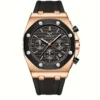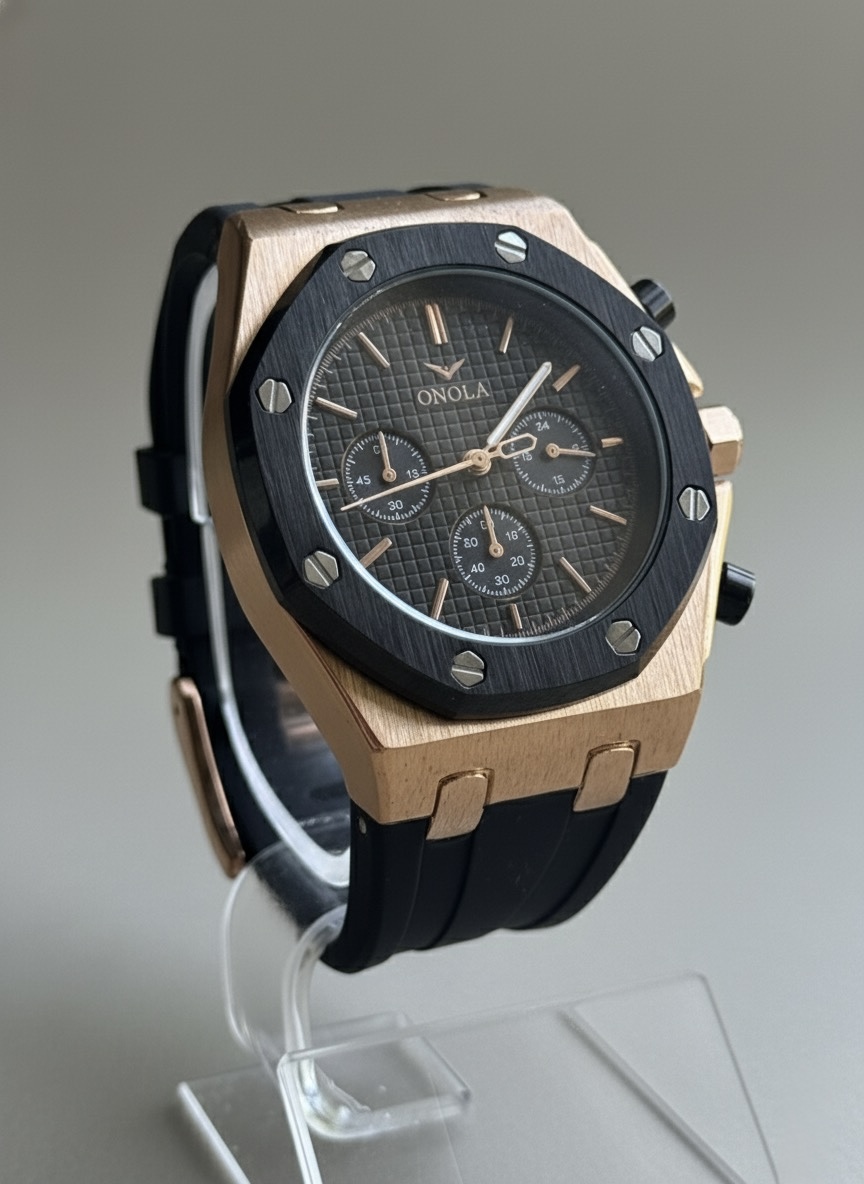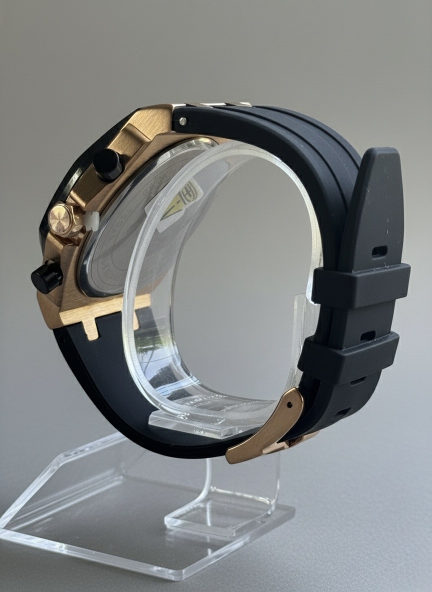 Diseño moderno en oro rosa con correa de silicona resistente. Su esfera texturizada incluye subesferas totalmente funcionales para cronómetro y fecha. Movimiento de cuarzo preciso, ideal para uso diario con un estilo elegante y deportivo.