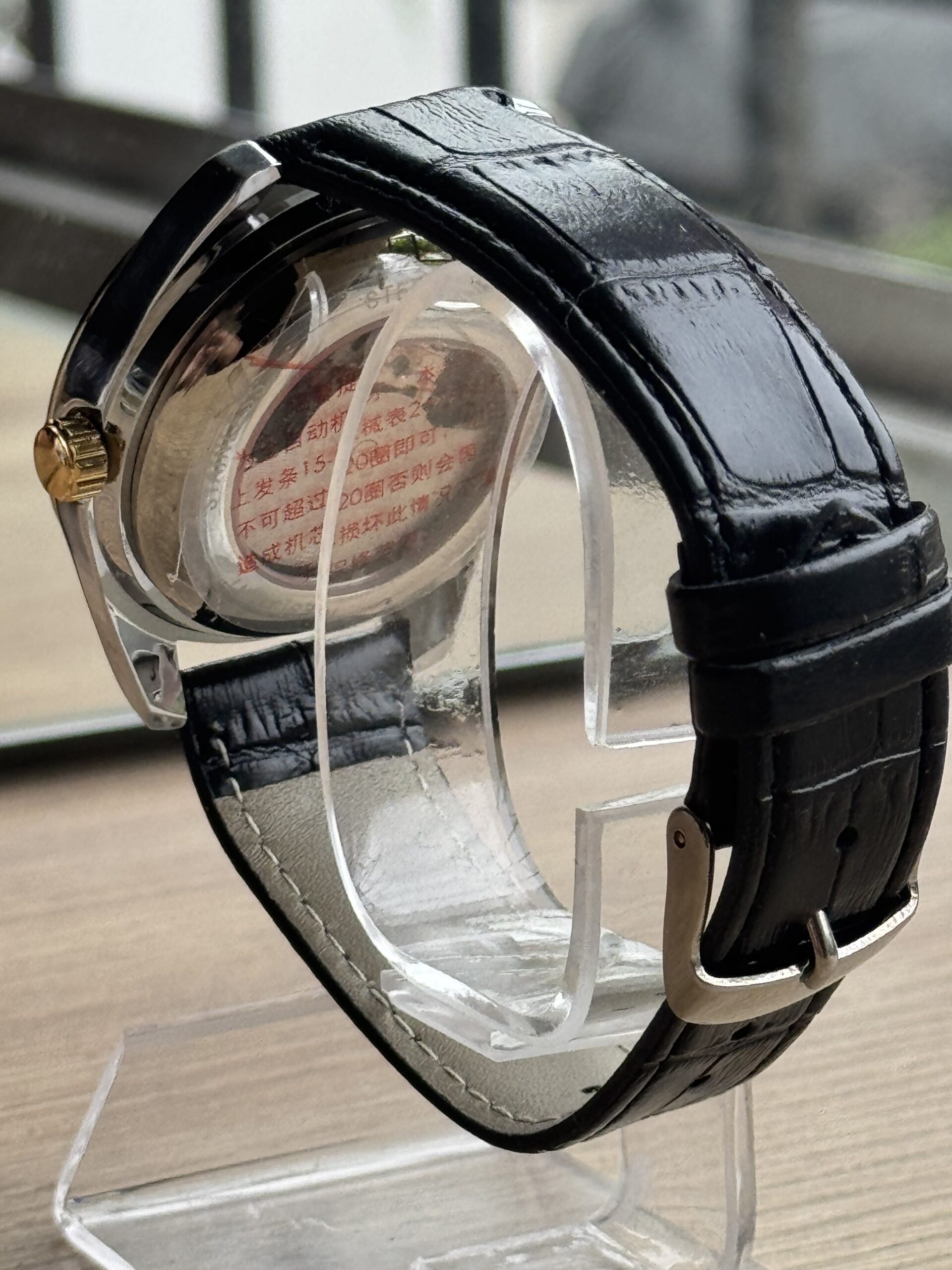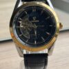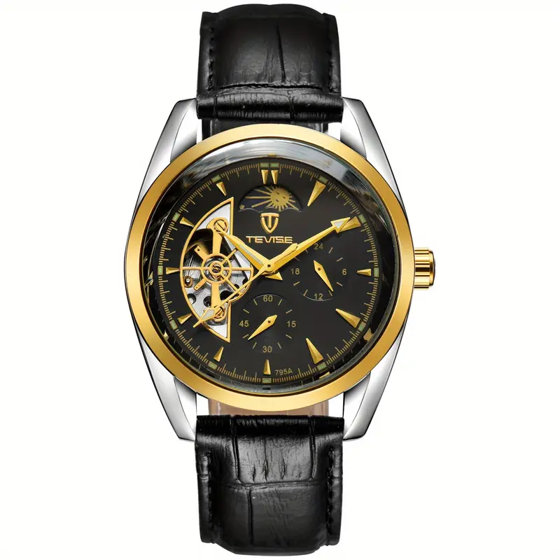 Elegante reloj mecánico automático con diseño negro y dorado, caja resistente y correa de cuero sintético. Su estilo casual con detalles visibles del mecanismo aporta un look moderno y distinguido, ideal para uso diario sin necesidad de batería.